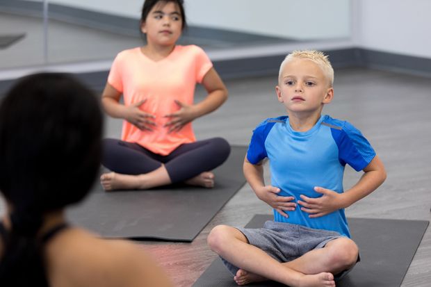 Young children learn breathing techniques in a yoga class.