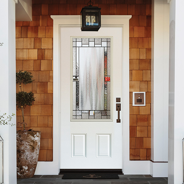 This attractive minimalist design blends textured glass with clear bevels providing simplicity and privacy.